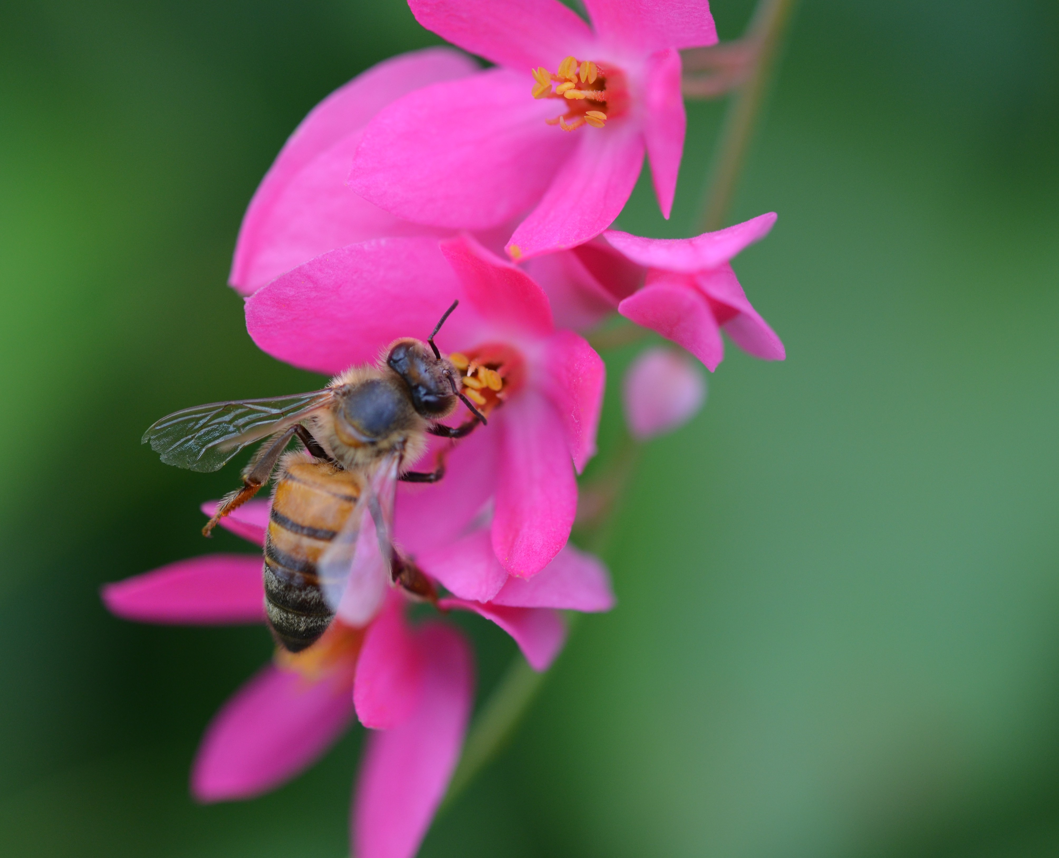 I waited a minute or two for this photo which lasted 1/400th of a second. I have learned not to chase and follow bees from flower to flower. Instead I stuck by one flower and waited for a bee to stop by. Bee photography 101 I bet.